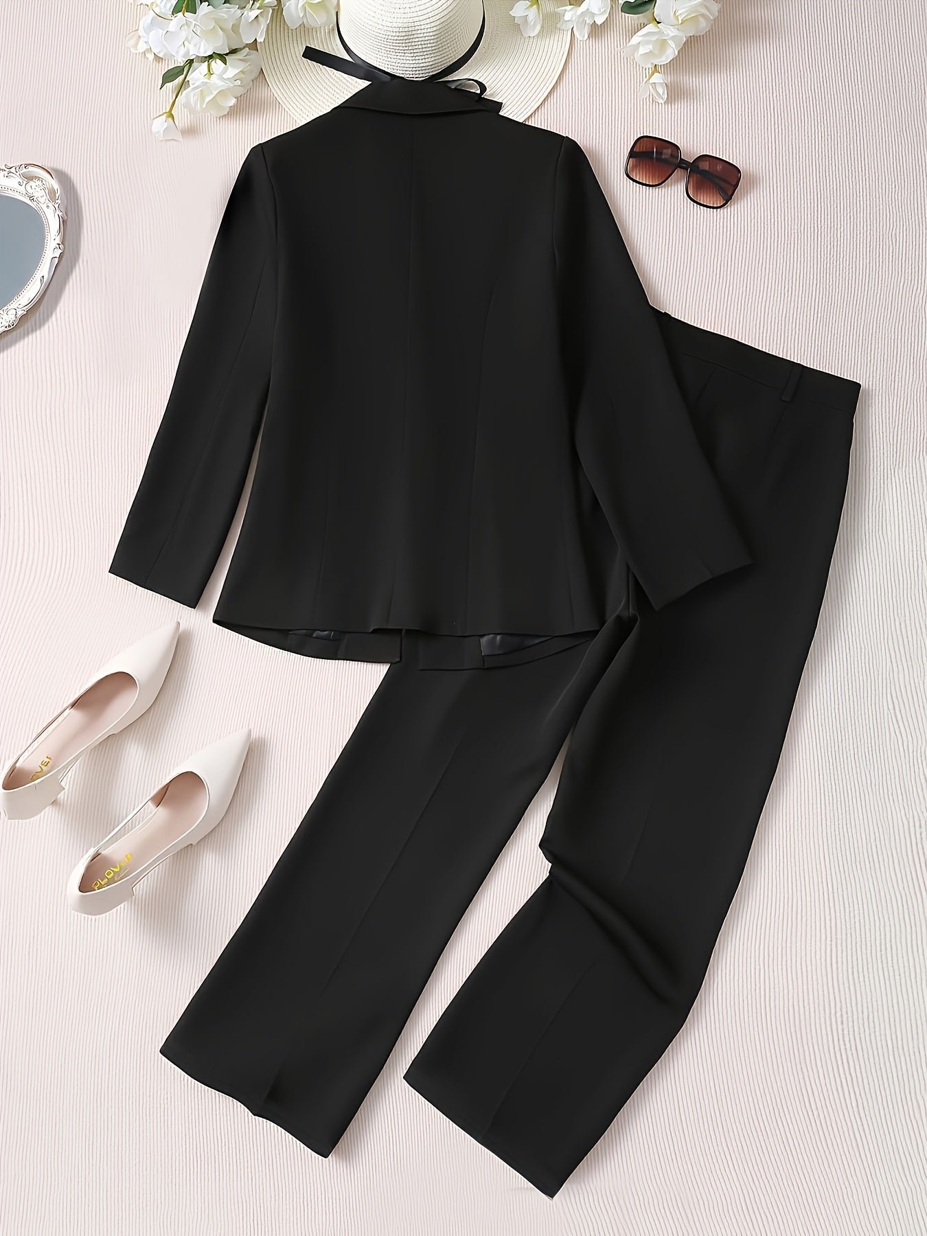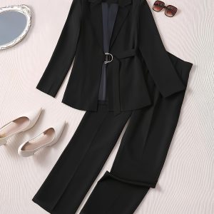 Be the first to review “Elegant Office Pants Set, Belted Lapel Long Sleeve Slim Blazer & High Waist Straight Leg Loose Pants, Women’s Clothing”