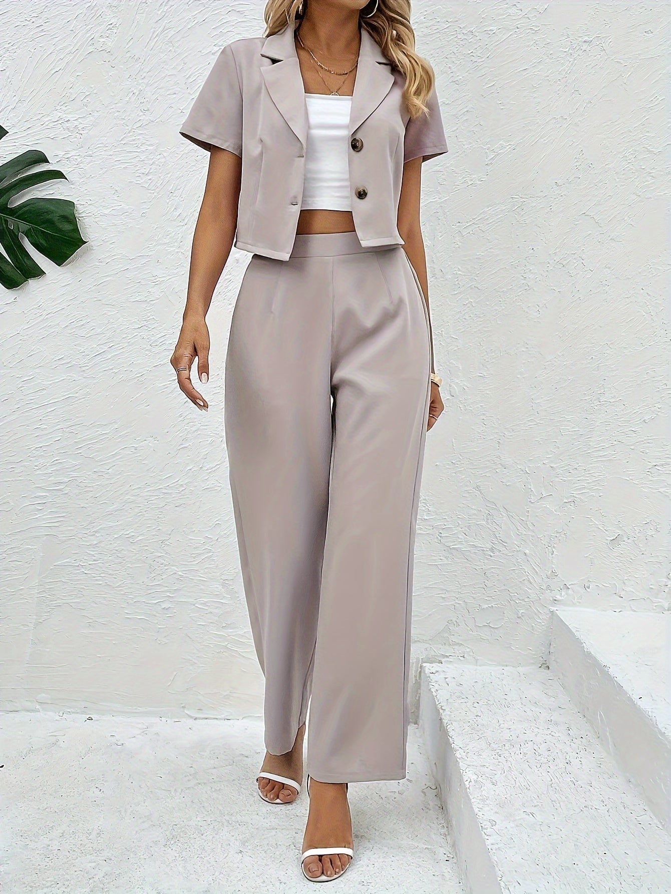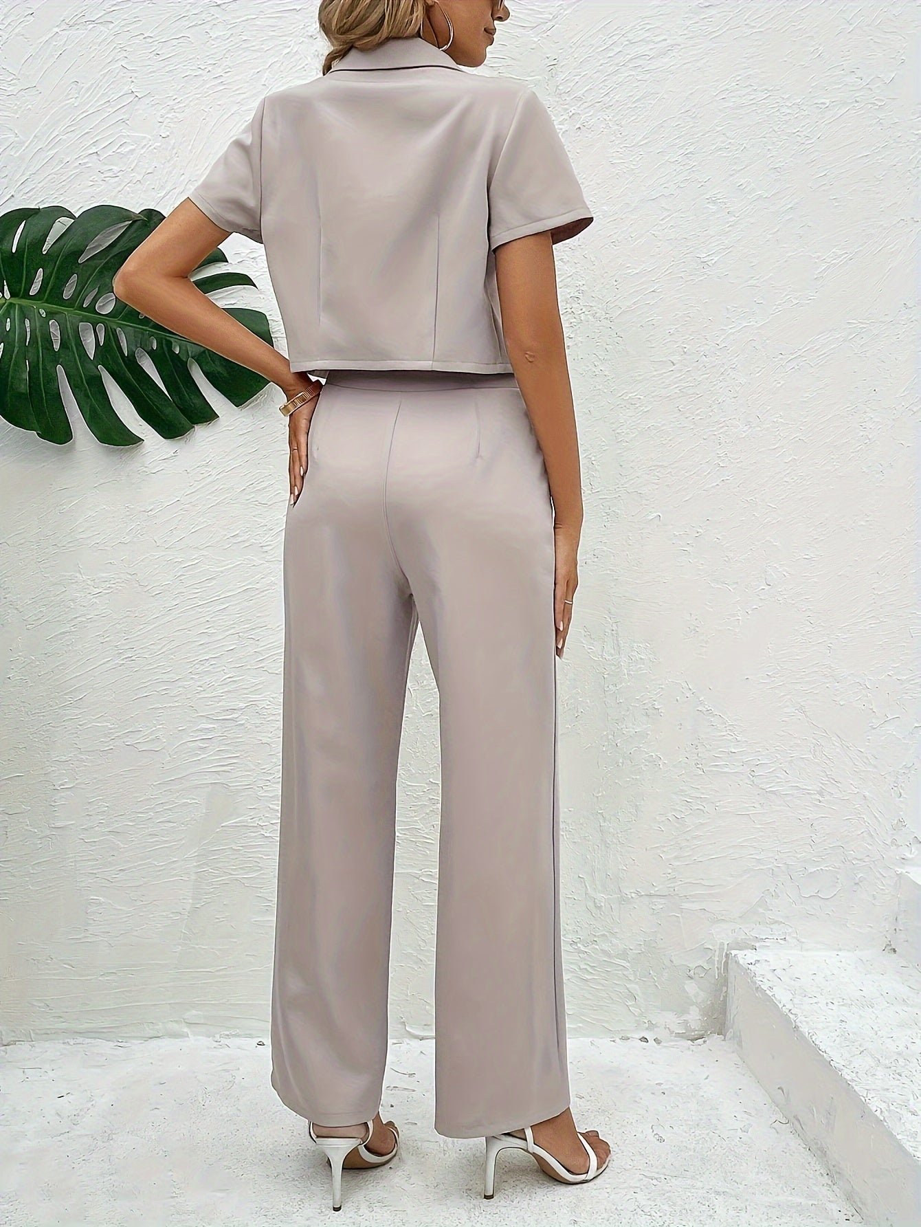 Solid Color Botton Two Piece Blazer Set, Elegant Lapel Long Sleeve Blazer & Pants For Office & Work, Women’s Clothing