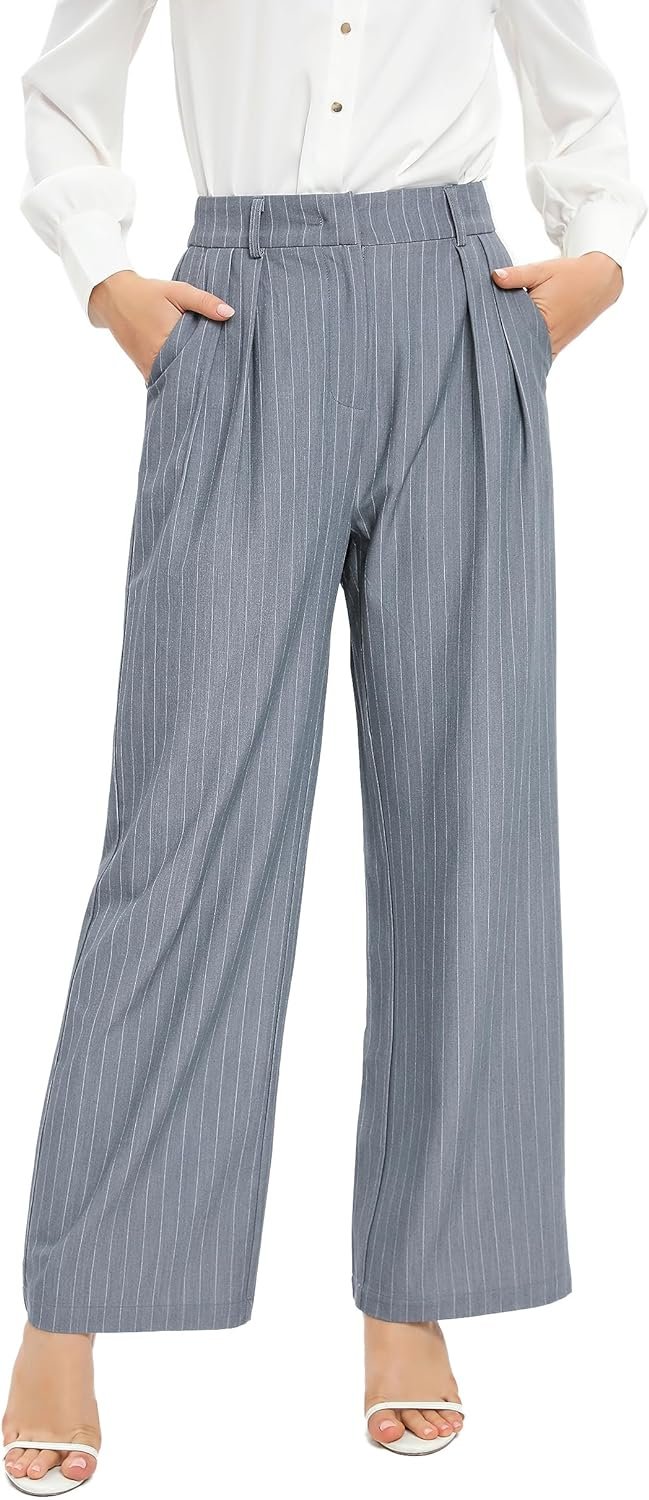 Women’s Casual Striped High Waisted Wide Leg Pants Elastic Waist Loose Fit Trousers