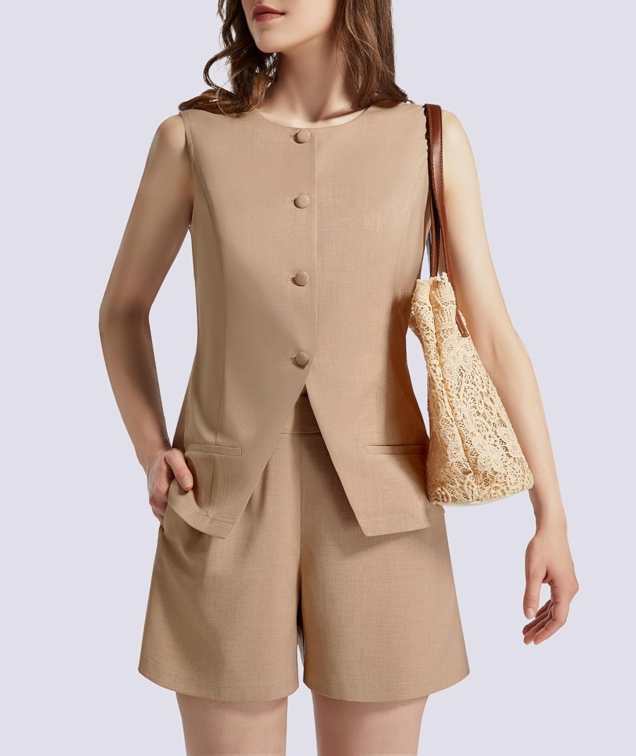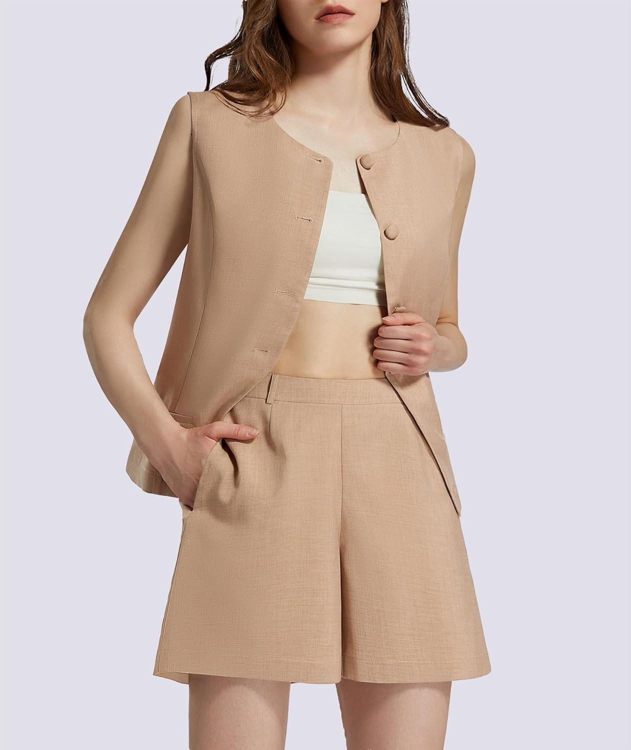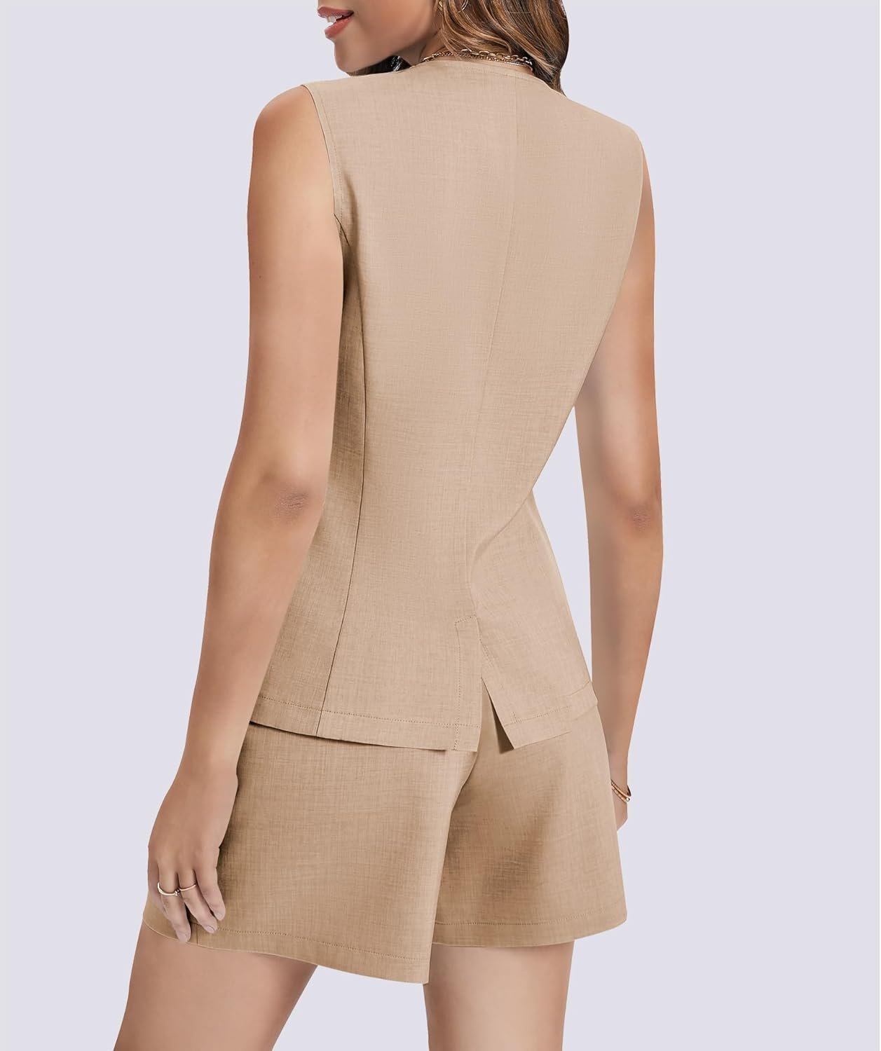 Women’s Summer 2 Piece Outfits Sleeveless Round Neck Button Down High Waisted Pants 2024 Business Work Sets
